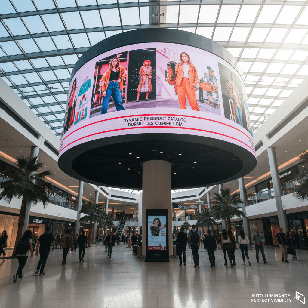 • Retail y Centros Comerciales: Desde anuncios de promociones hasta catálogos de productos dinámicos en un centro comercial de Barcelona. El brillo se ajusta automáticamente para una visibilidad perfecta a cualquier hora.