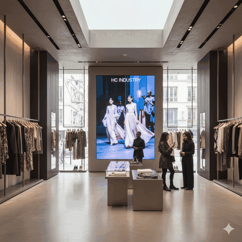 • Tiendas de moda y lujo, donde las pantallas interiores proyectan campañas visuales que refuerzan el estilo y exclusividad de la marca.
