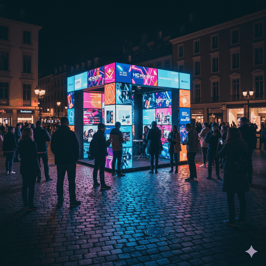 • Ferias y pop-up stores, donde el diseño modular y portátil de HC Industry facilita el montaje rápido y la adaptación del contenido.